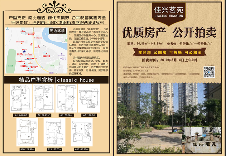 一、拍賣(mài)標(biāo)的:坐落于瀘州市江陽(yáng)區(qū)華陽(yáng)街道學(xué)院西路372號(hào)“佳興茗苑”小區(qū)第一批次住房。(詳見(jiàn)房屋清單)